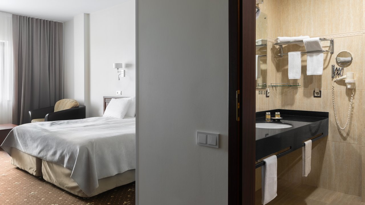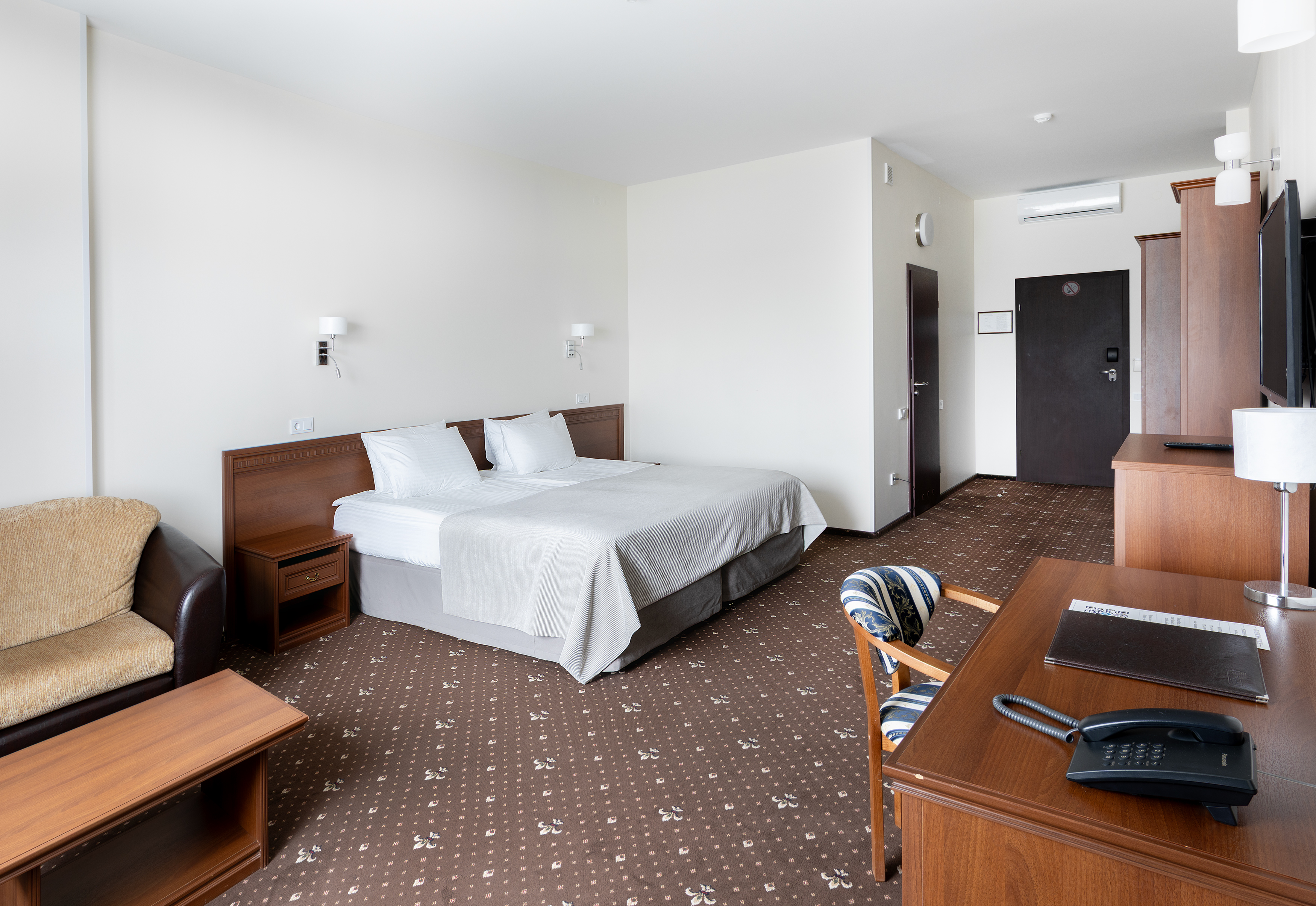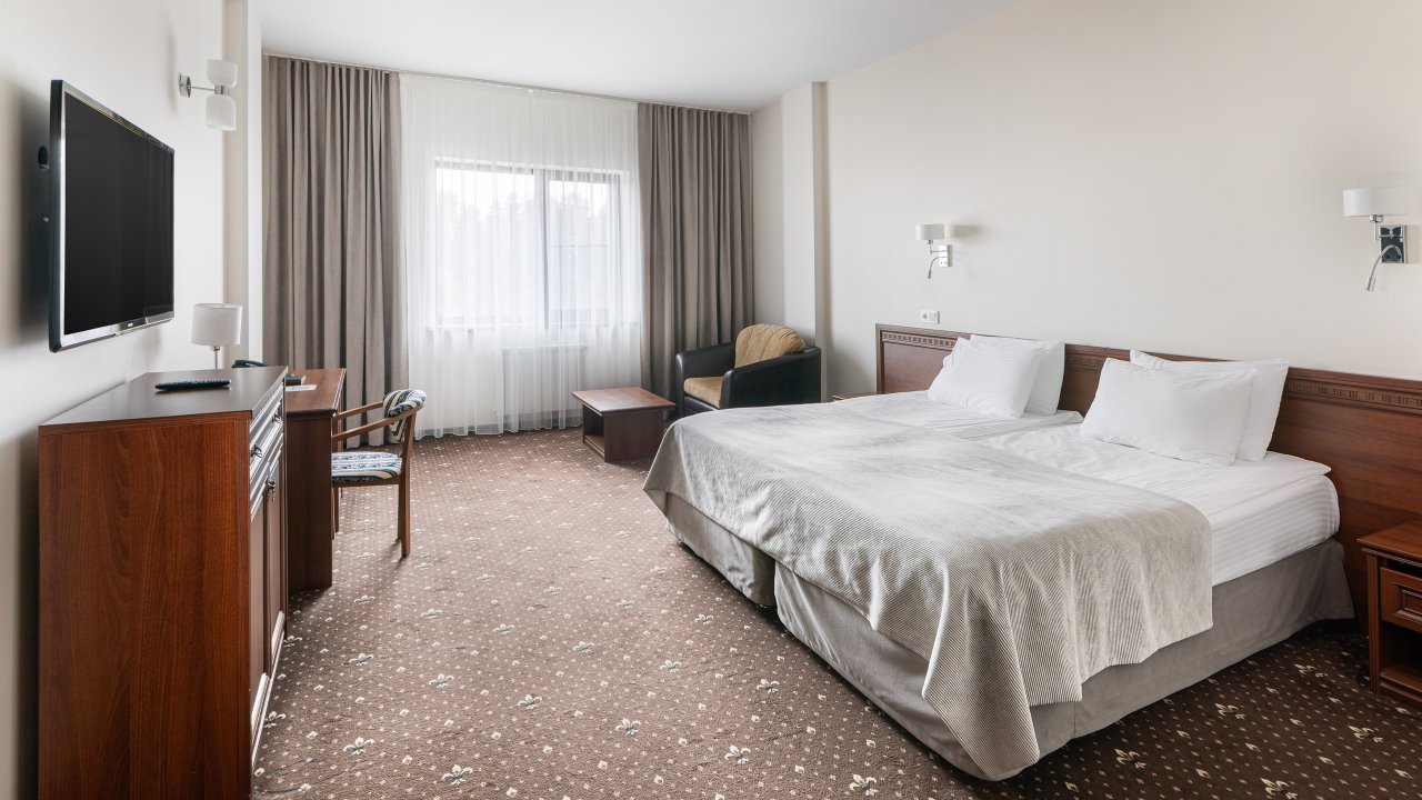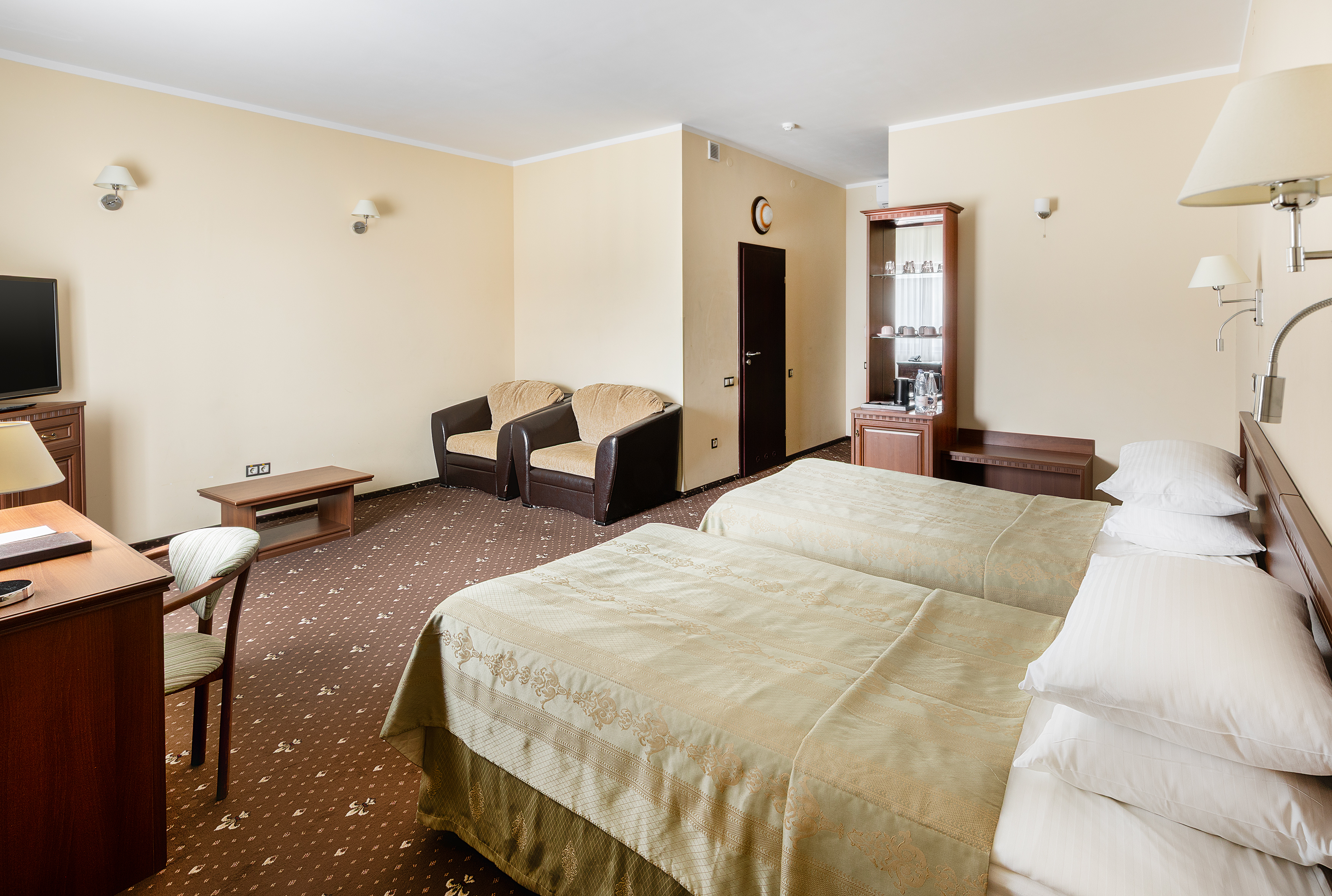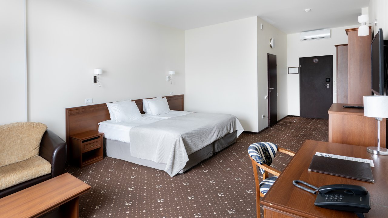 Элегантный дизайн интерьера и уютная обстановка улучшенного однокомнатного номера Business отлично подойдет для длительного отдыха. Преимуществом комфортабельного номера является большая площадь и наличие дополнительного спального места.